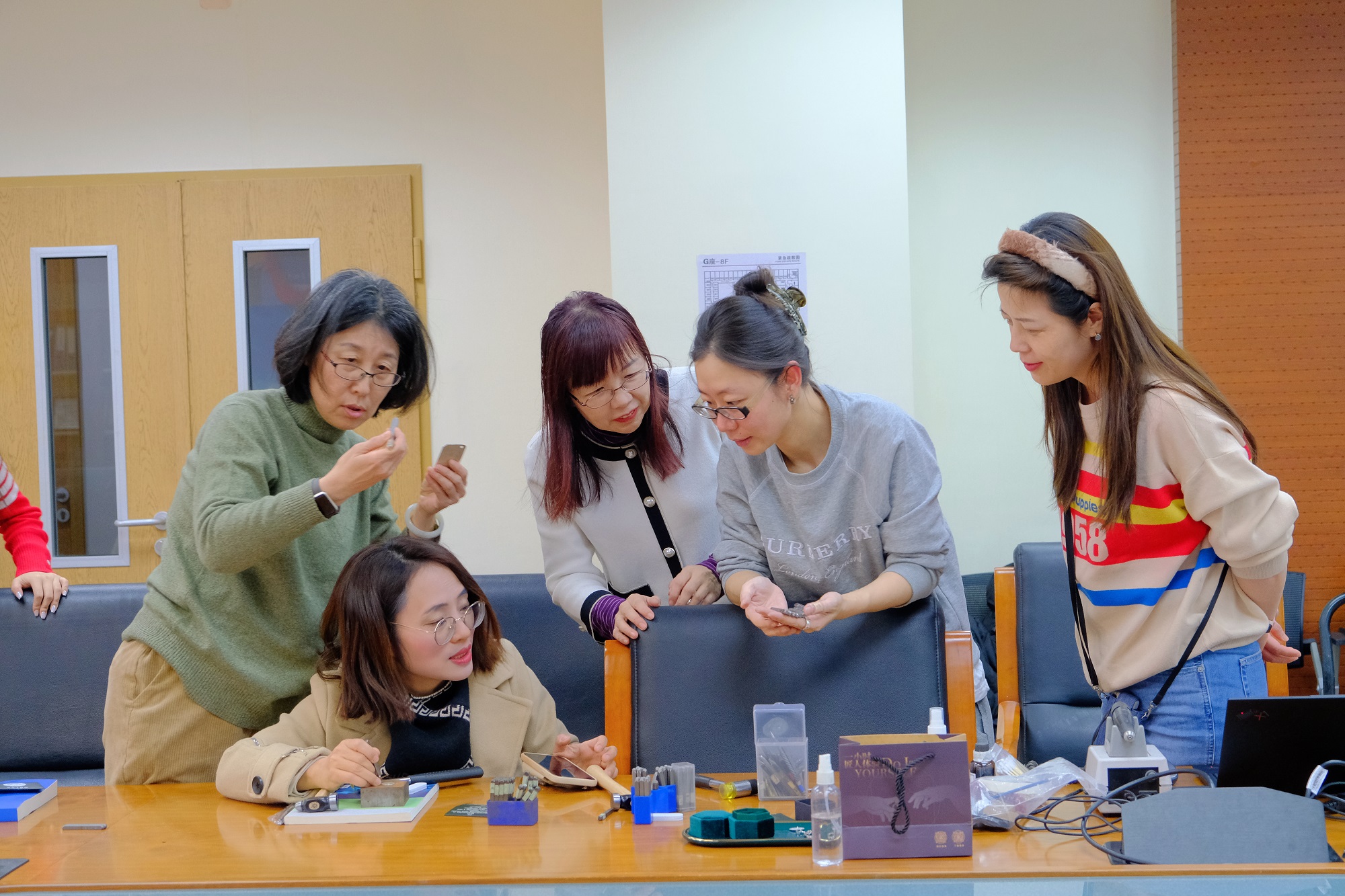 在专业老师的带领下,大家了解了常见银饰的种类、如何分辨真假银饰,学习了银饰的养护和搭配。 银饰在我国各民族服饰文化中,有着举足轻重的地位,它寓意真善美。在掌握了理论知识以后,大家迅速投入到制作过程中,先设计好图案,再用铁锤敲制刻字,制作肌理,然后放置在方铁上,用胶锤敲击银饰使其平整。最后交给老师打磨打孔、做旧抛光。