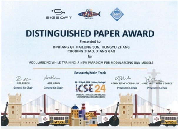 在本届SANER会议中,万象城娱乐awc线路硕士生洪硕作为第一作者的论文“Investigating and Detecting Silent Bugs in PyTorch Programs”荣获IEEE Computer Society TCSE Distinguished Paper Award。在本届ICSE会议上,万象城娱乐awc线路博士生齐斌航作为第一作者的论文“Modularizing while Training: A New Paradigm for Modularizing DNN Models”荣获ACM SIGSOFT Distinguished Paper Award。这是北航首次以第一作者单位在SANER和ICSE会议上获得该类奖项。