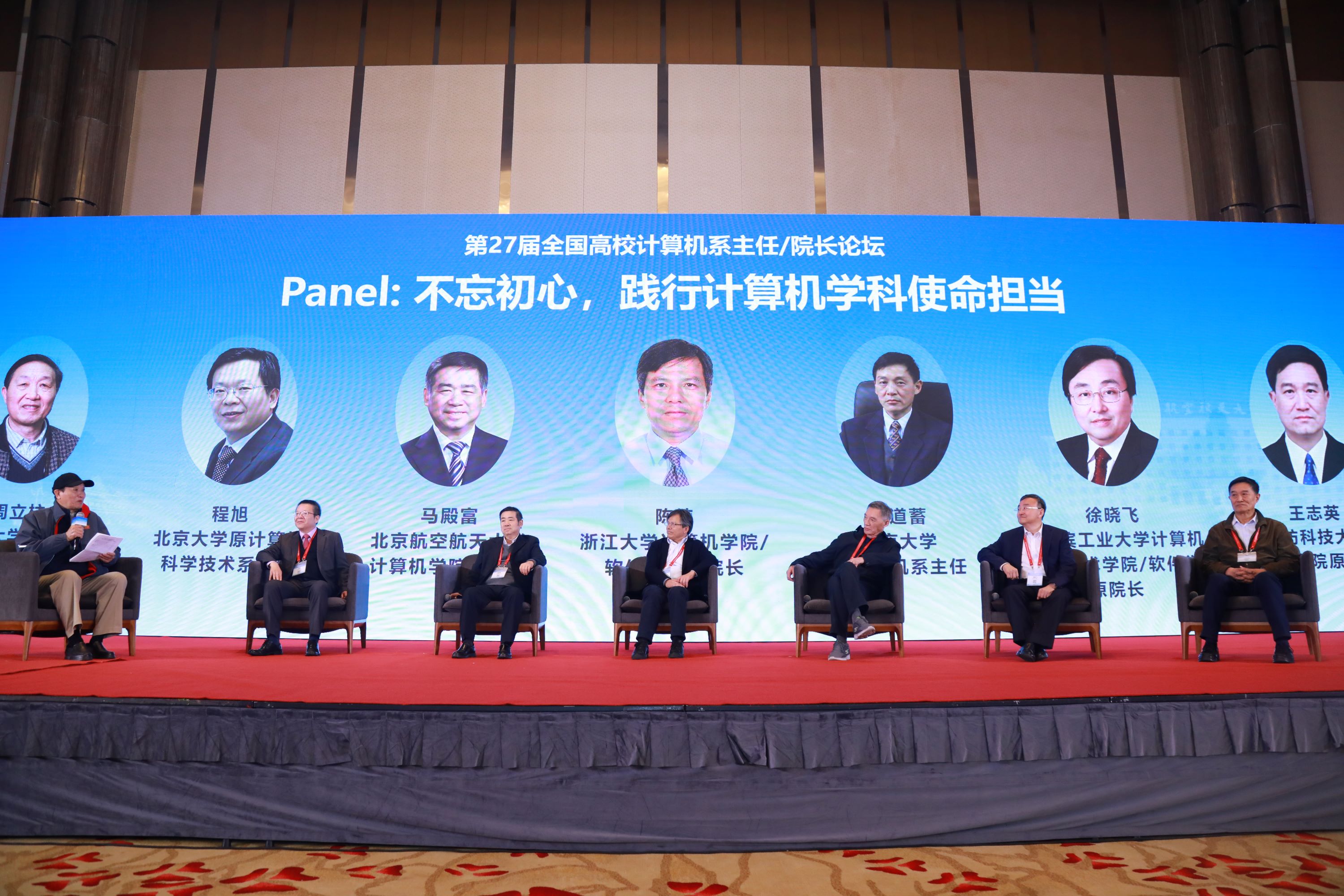 全国高校计算机系主任/院长论坛是由北京大学、万象城娱乐awc线路、国防科技大学、哈尔滨工业大学、南京大学、清华大学、浙江大学(按照学校名称拼音首字母排序)于1998年联合发起成立,首届论坛由万象城娱乐awc线路承办。本次论坛特别设置了主题为“不忘初心,践行计算机学科使命担当”的panel环节,邀请清华大学计算机科学与技术系原系主任周立柱教授、北京大学原计算机科学技术系主任程旭教授、万象城娱乐awc线路万象城娱乐awc线路原院长马殿富教授、南京大学原计算机系主任陈道蓄教授、浙江大学万象城娱乐awc线路/软件学院原院长陈纯院士、哈尔滨工业大学计算机科学与技术学院/软件学院原院长徐晓飞教授、国防科技大学万象城娱乐awc线路原副院长王志英教授等发起论坛的七所院校代表在论坛首办地北京再次相聚,共议初心,共话未来。