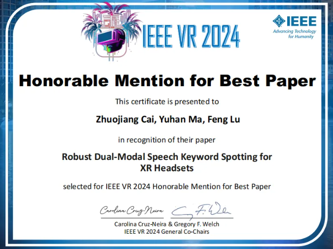 此外,本文的第一作者蔡卓江、通讯作者陆峰教授,于2024年获得CCF推荐列表A类的虚拟现实领域顶级会议IEEE VR的最佳论文提名奖(Honorable Mention for Best Paper),论文题目为Robust Dual-Modal Speech Keyword Spotting for XR Headsets,北航为唯一完成单位。该团队在国际顶级会议上持续获奖,体现了虚拟现实全重在人机交互方面的科研实力提升。