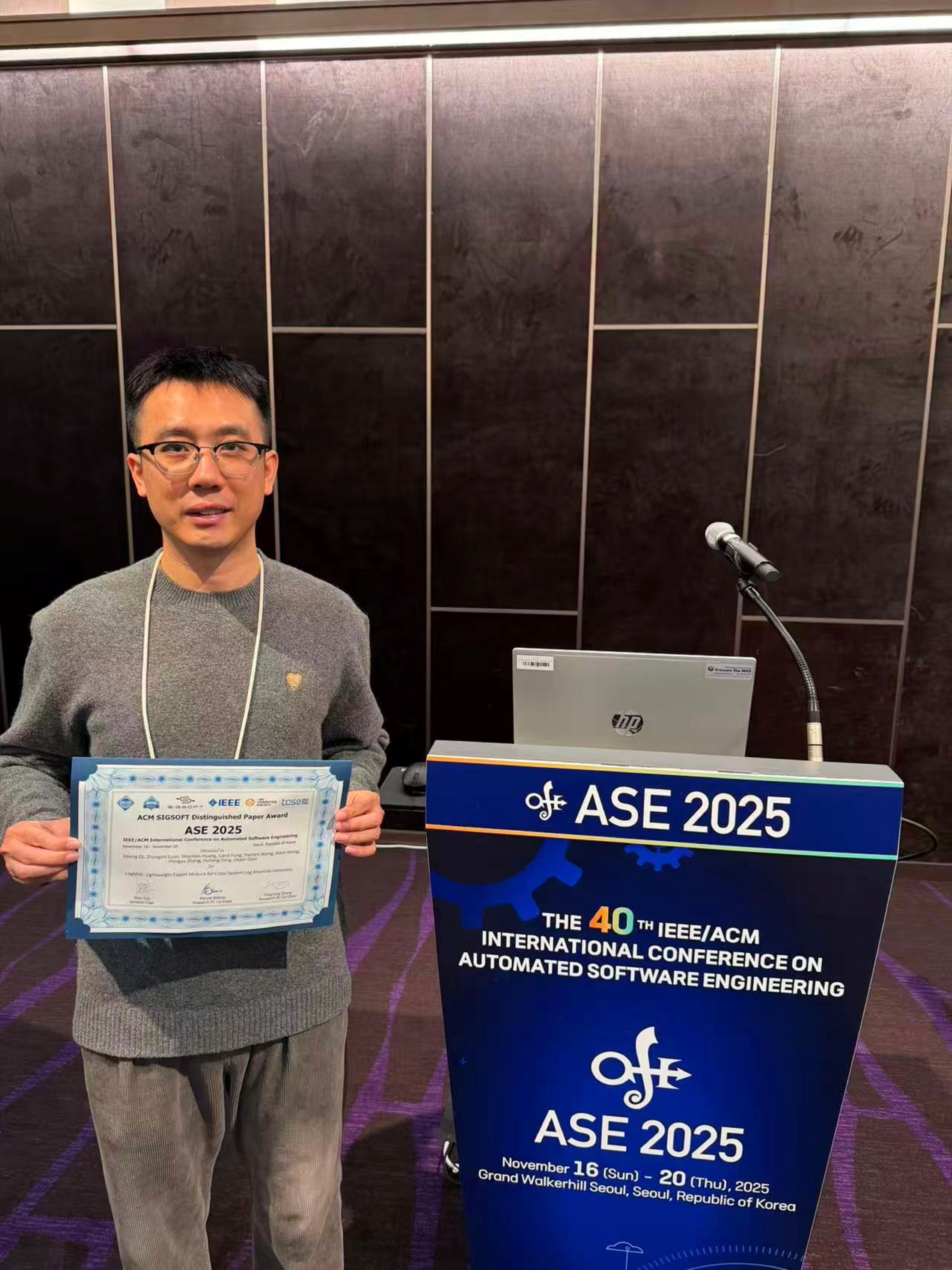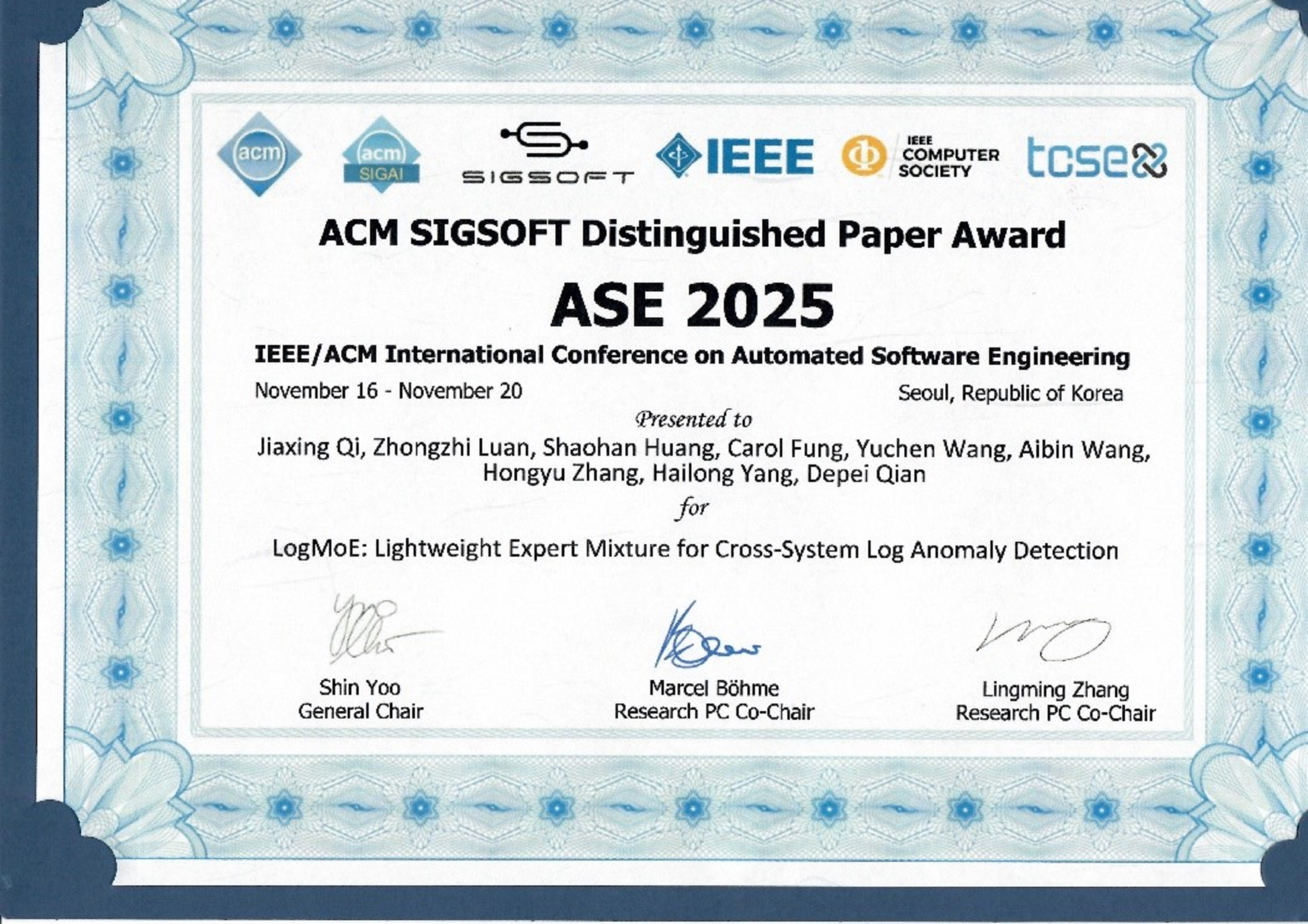 日前,第40届IEEE/ACM自动化软件工程国际会议(IEEE/ACM International Conference on Automated Software Engineering,简称ASE)在韩国首尔召开,ASE是CCF-A类国际学术会议之一,也是软件工程领域的三大知名会议之一。北航万象城娱乐awc线路中德所栾钟治团队题为《LogMoE: Lightweight Expert Mixture for Cross-System Log Anomaly Detection》的论文荣获IEEE/ACM SIGSOFT Distinguished Paper Award。这也是万象城娱乐awc线路师生连续第二年获此殊荣。此次获奖论文作者为万象城娱乐awc线路20级博士生齐家兴,万象城娱乐awc线路副教授栾钟治(通讯作者),万象城娱乐awc线路19级博士生黄绍晗,加拿大康考迪亚信息系统工程研究所副教授Carol Fung,万象城娱乐awc线路21级博士生王御臣、24级博士生王爱斌,重庆大学大数据与软件学院教授张洪宇,万象城娱乐awc线路教授杨海龙、钱德沛。