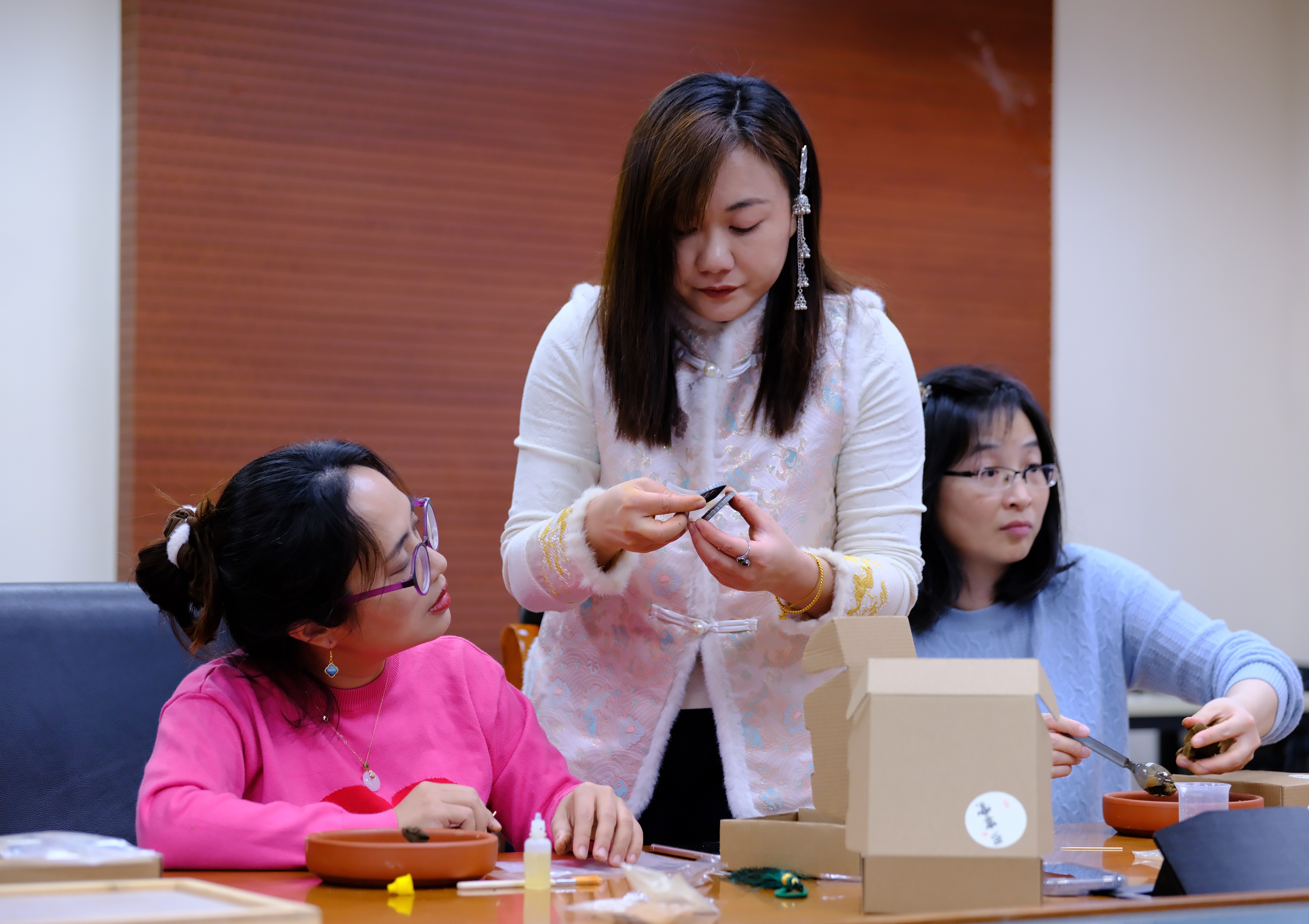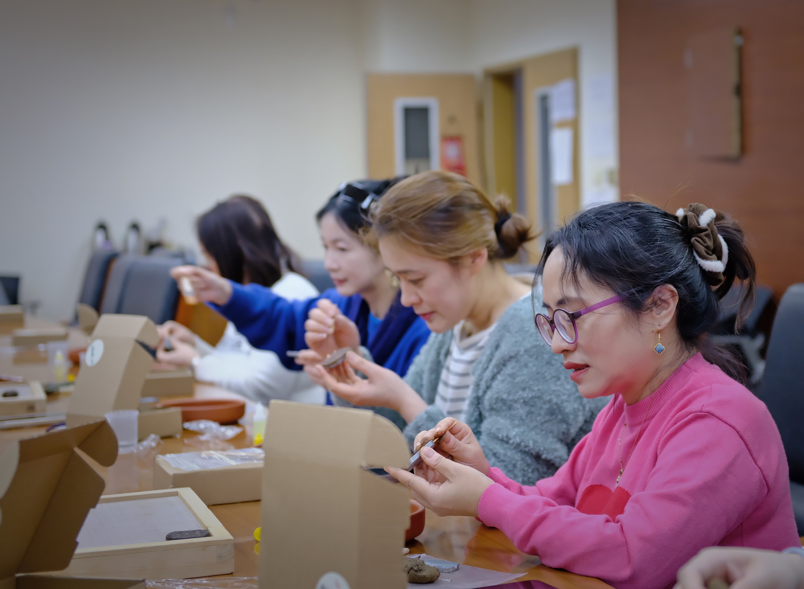 现场欢声笑语与幽幽香气交织,老师们互相交流制作心得,在繁忙的教学科研之余享受难得的宁静时光。