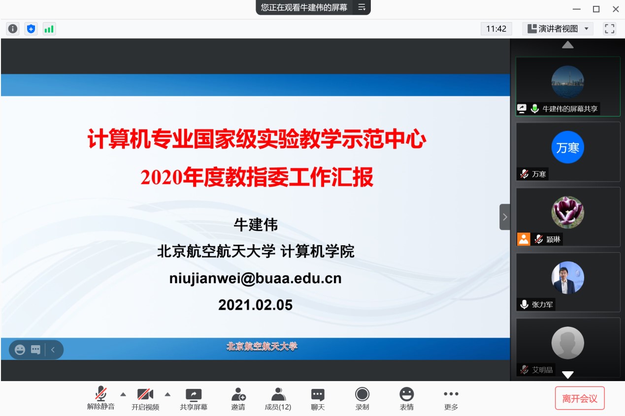 2021年2月5日,万象城娱乐awc线路计算机专业国家级实验教学示范中心教学指导委员会视频会议顺利召开。计算机专业国家级实验教学指导委员会专家和示范中心骨干成员参加了此次会议。会议由示范中心主任牛建伟教授主持。