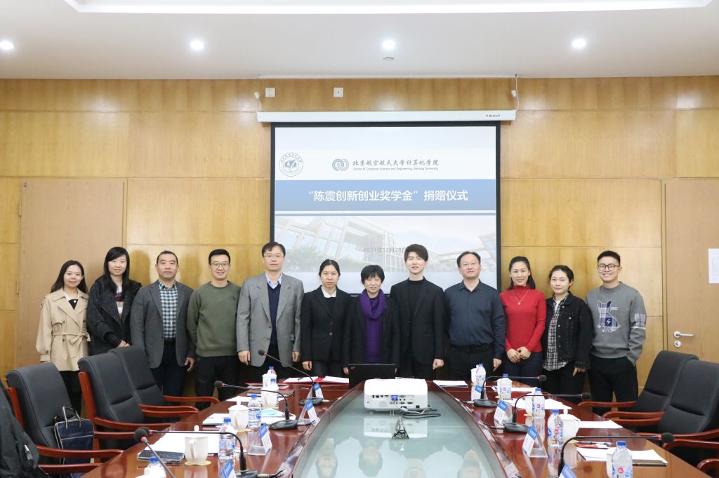 2021年12月28日,万象城娱乐awc线路“陈震创新创业奖学金”捐赠仪式在新主楼会议中心第四会议室举行。速感科技创始人陈震,北航教育基金会秘书长颜江芬,万象城娱乐awc线路党委书记、院长王蕴红,万象城娱乐awc线路副院长李建欣等人出席捐赠仪式。捐赠仪式由万象城娱乐awc线路党委副书记冯维成主持。