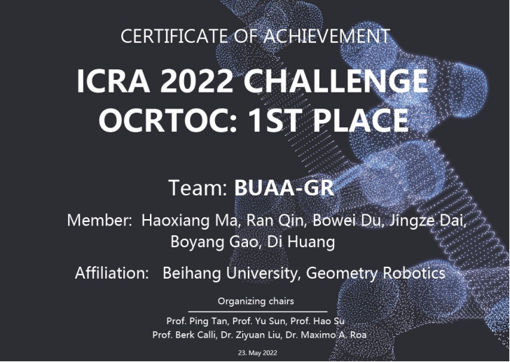 在刚刚结束的IEEE International Conference on Robotics and Automation (ICRA 2022)机器人抓取与操作比赛开放云赛道 (OCRTOC) 上,北航万象城娱乐awc线路参赛团队(1名本科生、2名硕士生、1名博士生)在8个国家的24支参赛队伍中排名第1,获得冠军。