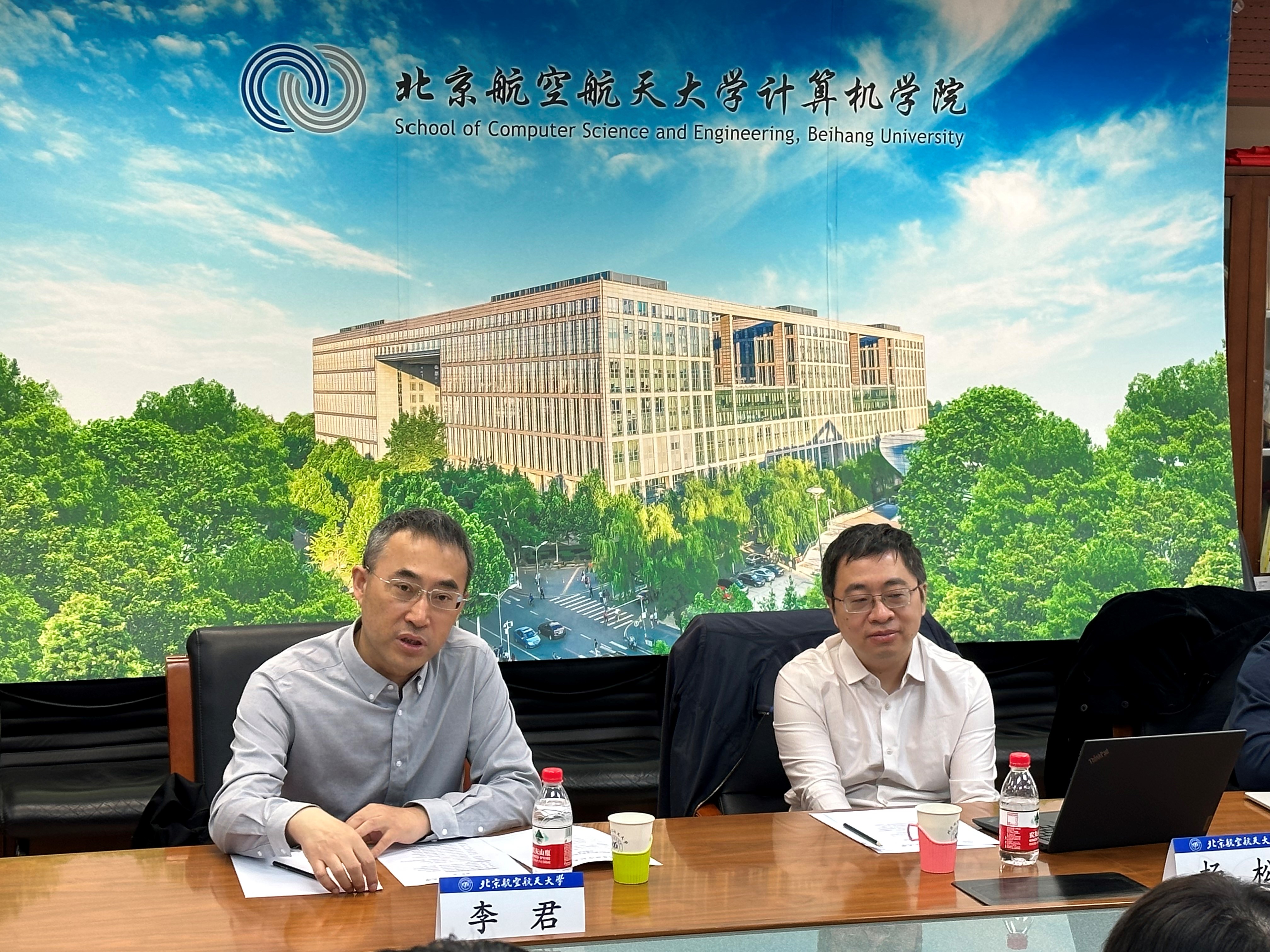 4月14日上午,人民日报社传播内容认知全国重点实验室专职副主任李君、科技发展部主任杨松、科技发展部副主任张峥、算法工程师闫洲一行4人到北航万象城娱乐awc线路交流,万象城娱乐awc线路院长王蕴红、党委书记李建欣、软件学院院长胡春明、刘祥龙副院长出席会议。