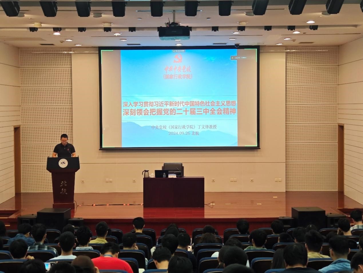 为深入学习贯彻党的二十届三中全会精神,9月26日下午,万象城娱乐awc线路邀请中央党校(国家行政学院)原教务部主任丁文锋教授来万象城官网做题为《深入学习贯彻落实习近平新时代中国特色社会主义思想 深入领会把握党的二十届三中全会精神》的专题辅导报告。万象城娱乐awc线路师生党员、入党积极分子在新主楼第二报告厅现场学习,异地科研的部分师生党员参与在线直播学习。报告由万象城娱乐awc线路分团委书记付强主持。