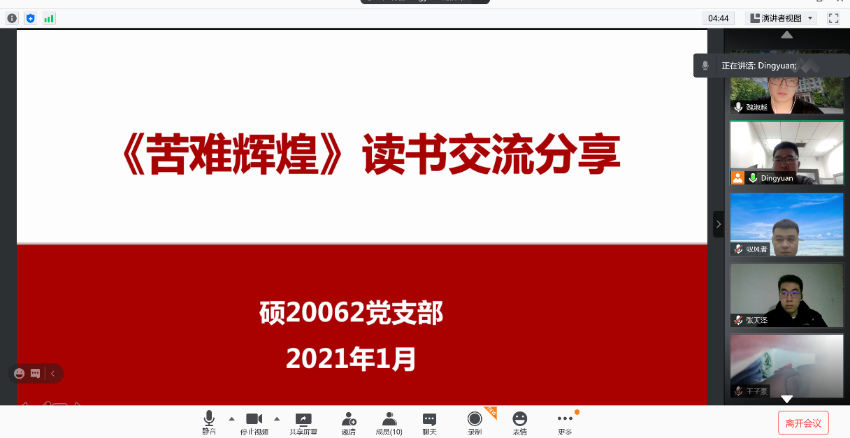 本次读书分享活动是万象城娱乐awc线路硕20062党支部“苦难而辉煌”——建党百年系列又一学习活动。接下来,硕20062党支部将继续有序开展各项学习活动,确保支部党员加深对我党革命先辈大无畏精神的认识,缅怀革命先烈,加强党性修养,为成为新时代的优秀大学生党员不懈奋斗。