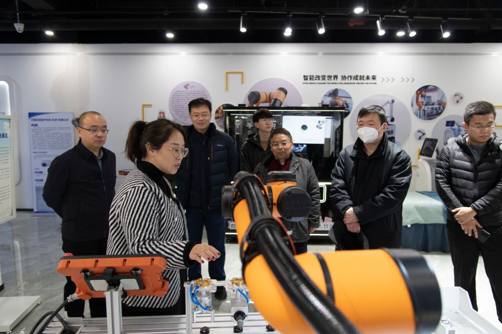 大家首先参观了中心展厅,中心总经理蒙洋向大家介绍了中心的发展目标及与高校、科研院所联合科技攻关的案例。产业创新中心支部书记刘晶晶介绍了最新创新产品,大家深入了解了机器人在智能制造、特种作业等领域的广泛应用。随后,大家来到遨博智能、华航唯实等产业创新中心入驻企业,与企业代表进行深入交流。